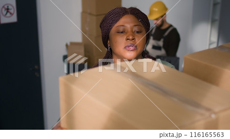 African american manager in warehouse handling cardboard boxes full of products ready to be shipped to clients. Meticulous supervisor in storage hub placing parcels on cabinet shelves