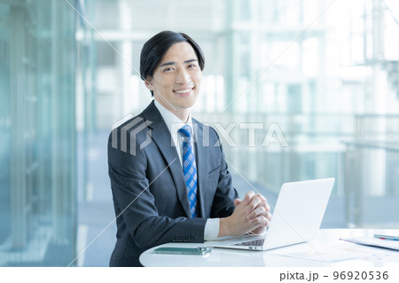 デスクのノートパソコンの前に座る笑顔のビジネスマンのポートレート