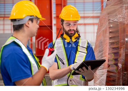 Foreman or worker work at Container cargo site check up goods in container.