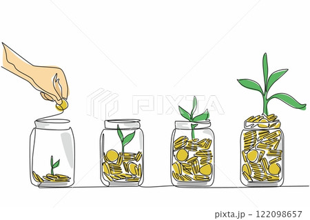 Single one line drawing hand inserts a coin into a jar containing a pile of coins and a tree. Investment for the future. National Financial Awareness Day. Continuous line design graphic illustration