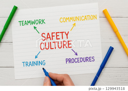Handwritten safety culture map highlighting teamwork, communication, training, and procedures, drawn with colorful pens on white desk