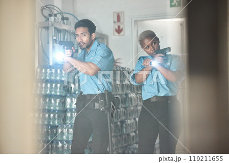 Police, man and woman with gun, investigation and inspection with torch, focus and search for criminal. Security team, justice and stop crime with pistol, law enforcement and government job in night