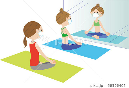 マスクをしてスカ・アーサナ(安楽座のポーズ)のポーズでヨガレッズンを受ける女性2人と鏡