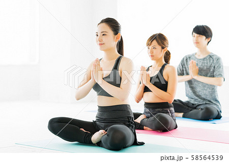 スカ・アーサナ(安楽座のポーズ)のヨガをする女性グループ