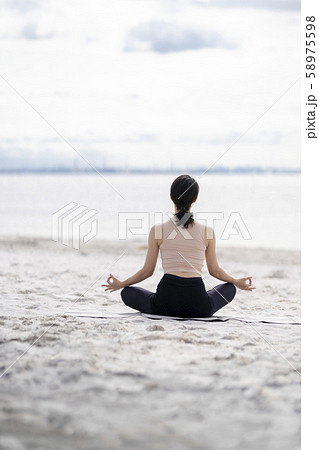 ヨガ 海岸の砂浜で瞑想リラックス解放感(安楽座のポーズ)