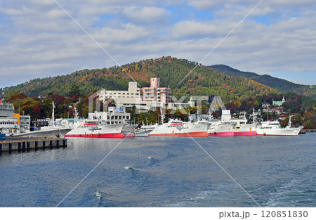宮城県 気仙沼市 気仙沼湾 遊覧船から眺める係留岸壁の漁船と紅葉の安波山