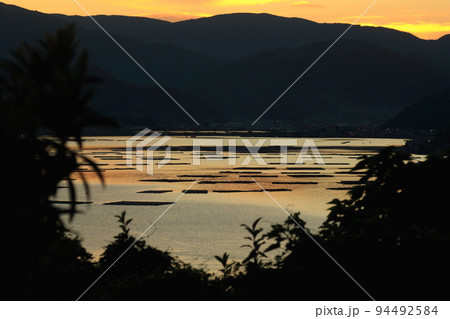 夕暮れの海に浮かぶ牡蠣筏のシルエット