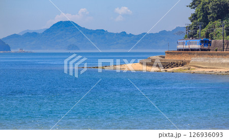 真っ青な瀬戸内海を背景に海岸線を走る呉線の観光列車