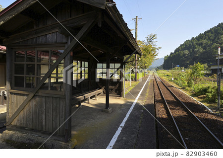 日本遺産に指定された鳥取県八頭町の若桜鉄道安部駅の駅舎とプラットホーム