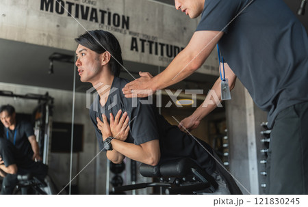 スポーツジムでパーソナルトレーニングを受ける若いアジア人男性