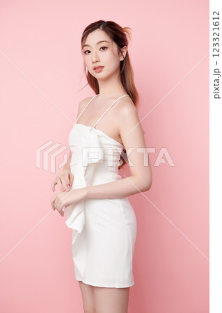 Beautiful face of young Asian woman in sexy dress white Perfect slim body on pink background, plastic surgery and aesthetic cosmetology, Facial and skin care concept