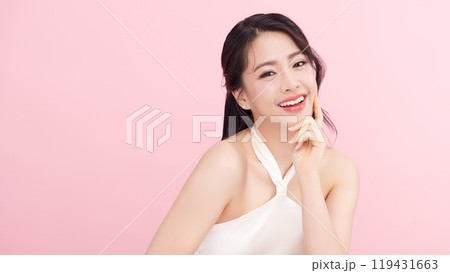 Beautiful young asian woman with clean fresh skin on pink background, Face care, Facial treatment, Cosmetology, beauty and spa, Asian women portrait.