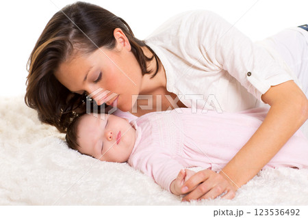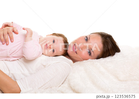 Baby girl and mother lying happy together on white fur