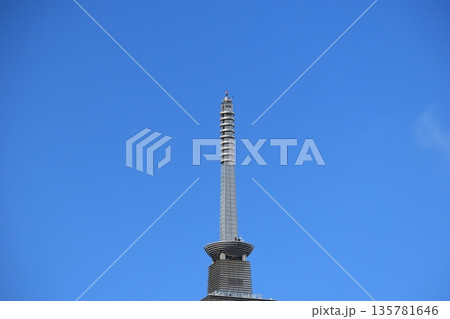 青空へ向かって真っ直ぐに伸びる木と絡まる蔦