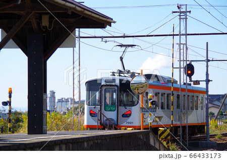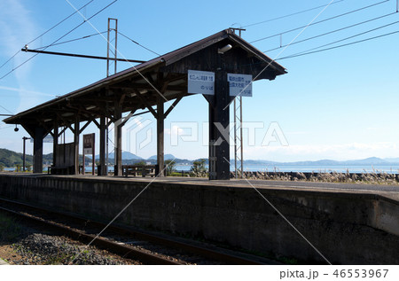 宍道湖沿線の国道沿いを走る一畑電車のレトロな駅のホーム … 島根県 松江市(快晴)