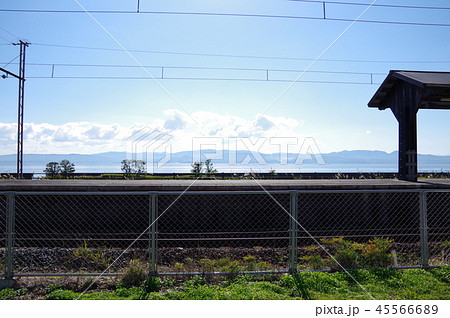宍道湖沿いを走る一畑電車の線路とレトロな駅のホームと青い空の風景 … 島根県 松江市(晴れ)