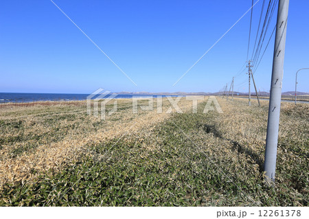 北海道宗谷の風力発電の風車と海岸