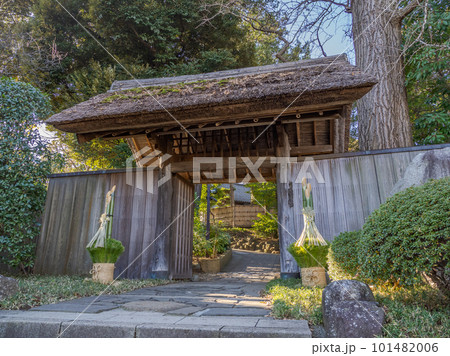 千葉県松戸市 門松が飾られている戸定が丘歴史公園・茅葺門