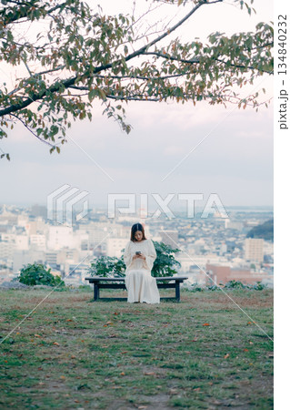 街並みを望む高台でスマートフォンを見る日本人女性