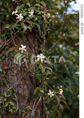 木にからんで伸びる、甘い香りのテイカズラの白い花