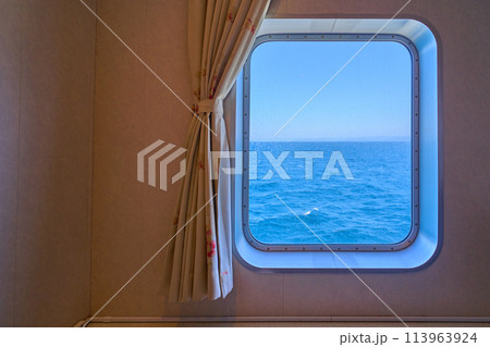 太平洋航行中のカーフェリーの客室の窓から海を見る