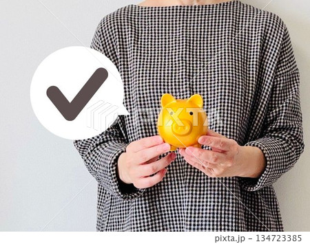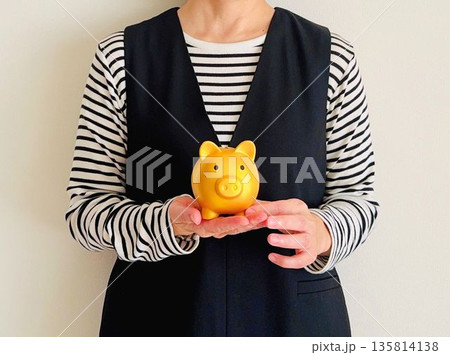 豚の貯金箱を持つ女性