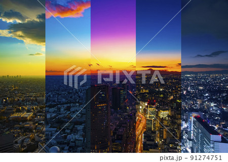 大阪市・JR東西線とJR神戸線の夕方から日没の眺望【6分割表示】