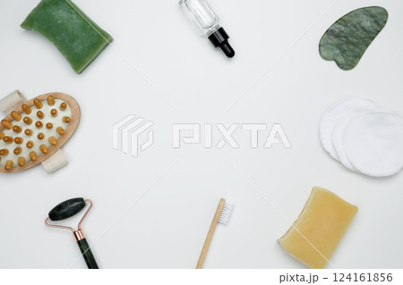 Eco-friendly beauty essentials, including soap, bamboo toothbrush, marble face roller, embodying a sustainable self-care concept