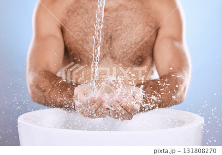 Water splash, hands and man in studio for skincare, wellness or cleaning on blue background. Hand, palm and skin male model relax in luxury, gentle or moisture or beauty, cosmetic treatment isolated