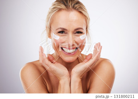 Skincare, eye cream and portrait of mature woman, anti ageing treatment and isolated on grey studio background. Health, skin and model face with smile and collagen mask on eyes in luxury spa facial.