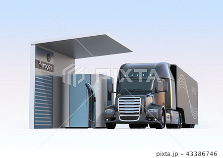 白バックにソーラーパネルが備える水素ステーションに水素ガス充填中のトラックのイメージ。