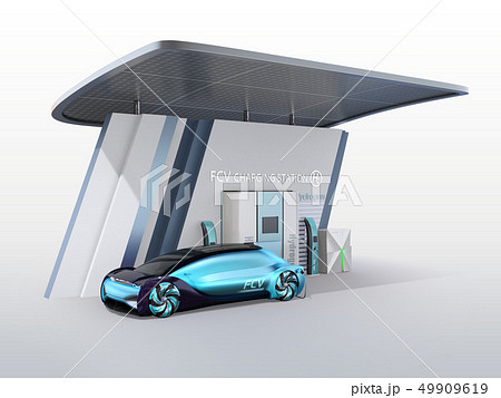 ソーラーパネルが備えている水素ステーションに駐車している自動運転FCVのイメージ