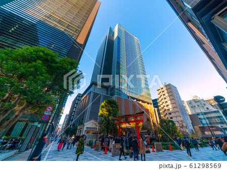 日本の東京都市景観 令和のお正月・ビルの谷間の福徳神社などを望む