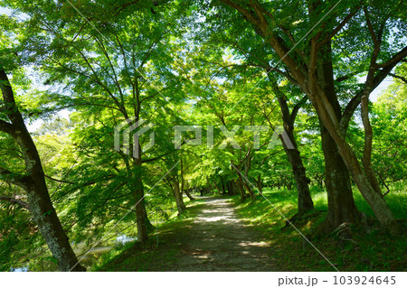 遊歩道 大沢池 若葉に新緑 青もみじ 大覚寺