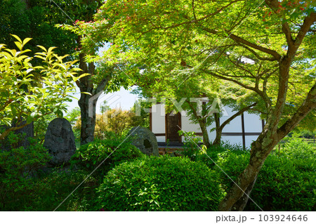 護摩堂と石仏群 大沢池 若葉に新緑 青もみじ 大覚寺