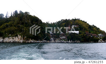 琵琶湖・竹生島かわらけ投げの鳥居と遊覧船