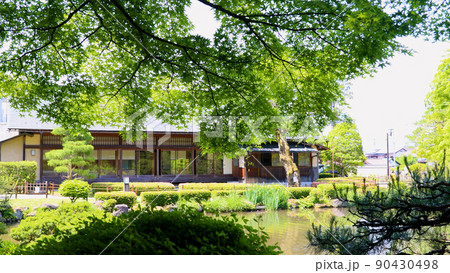 初夏の日本庭園と散歩する家族