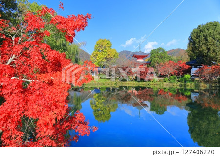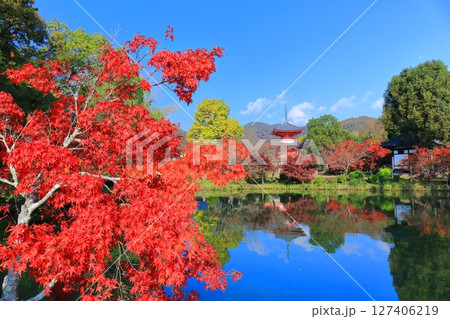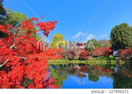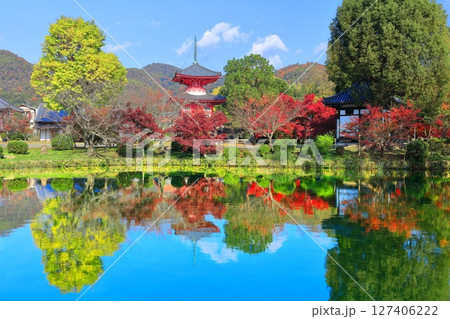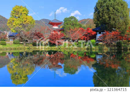 【京都府】シンメトリーな紅葉の大覚寺 心経宝塔(放生池)