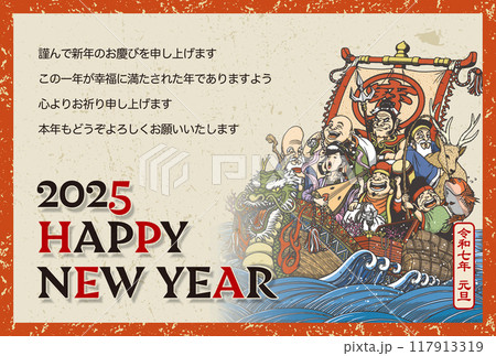 2025年賀状テンプレート「七福神と宝船」ハッピーニューイヤー 添え書き付