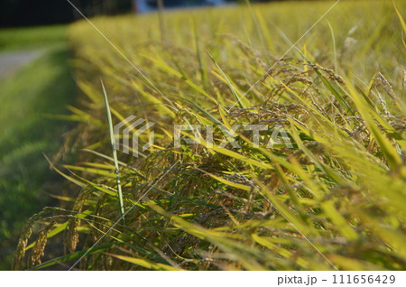 稲刈りの後、はさ掛けして乾燥・稲揚げして脱穀を待つ稲の穂先:お米・収穫・秋・日本のイメージ素材