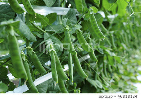 緑色の葉と白い花と緑の実のなるビッグエンドウの苗のある風景