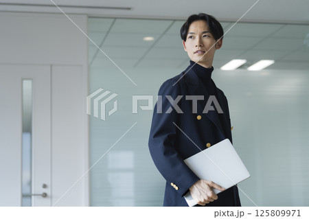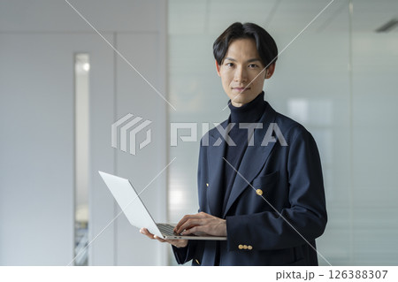 ノートパソコンを持った30代のビジネスマン カメラ目線