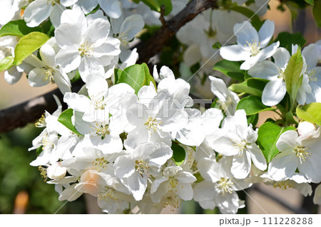 可愛らしい白い姫りんごの花と薄ピンクの蕾