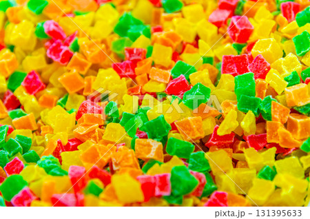 A close-up of a pile of candied fruit pieces. Sweet dried pineapple, orange, and papaya are used as fillings in confectionery and as an addition to breakfast muesli.