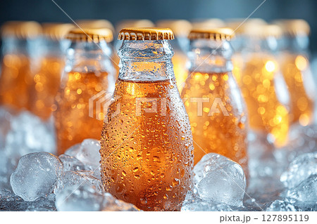 Summer colors. Retro cooler filled with glass soda bottles and ice. Retro style. Close-up.