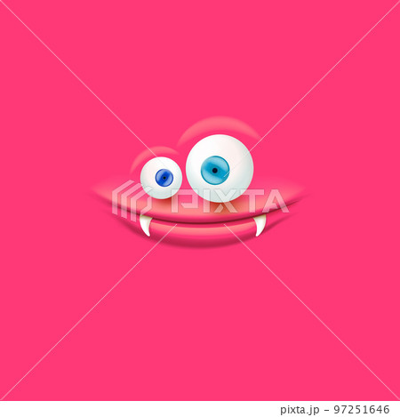 Vector funny pink monster face with open mouth with fangs and eyes isolated on pink background. Halloween cute and funky monster design template for poster, banner and tee print
