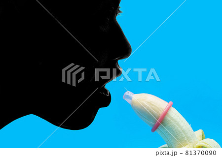 Unpacked condom and red lipstick on a yellow banana on pink studio background