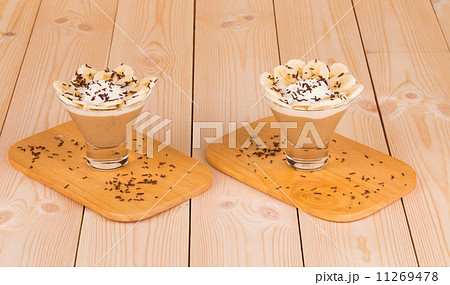 Dessert of banana, ice-cream, caramel, strawberry and mint