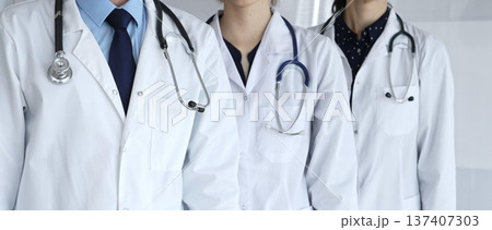 Medical team standing together, doctors and healthcare professionals wearing white lab coats and stethoscopes, symbolizing partnership and expertise in modern clinic or hospital environment