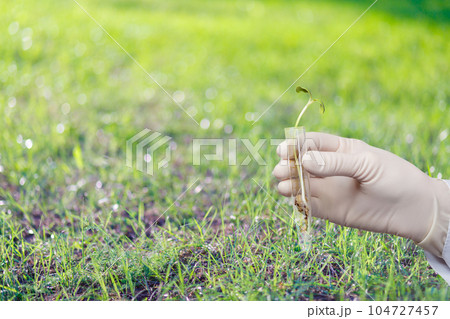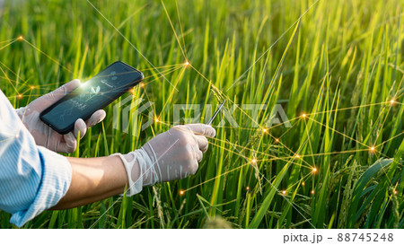 Science of plant research, Chromosome DNA and genetic, Development of plant varieties, Scientist researching and experiments genetic of flower with record data on mobile phone in the meadow.